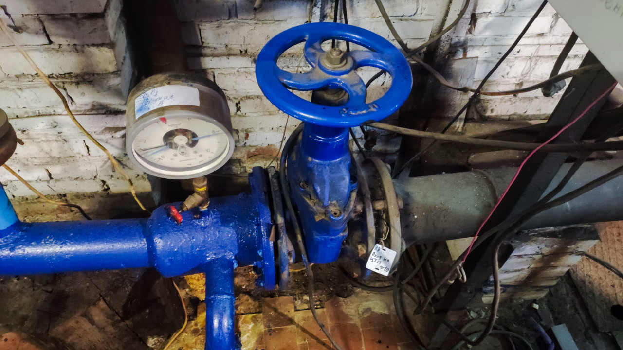 На фотографии изображён металлический вентиль с маховиком, установленный на трубопроводе, окрашенном в синий цвет. Рядом расположен манометр для измерения давления. К оборудованию подведены кабели, на заднем плане видна кирпичная стена помещения теплового узла. Снимок отражает реальное состояние инженерных коммуникаций, используется для иллюстрации работы систем отопления и водоснабжения, а также для учебных и технических материалов.