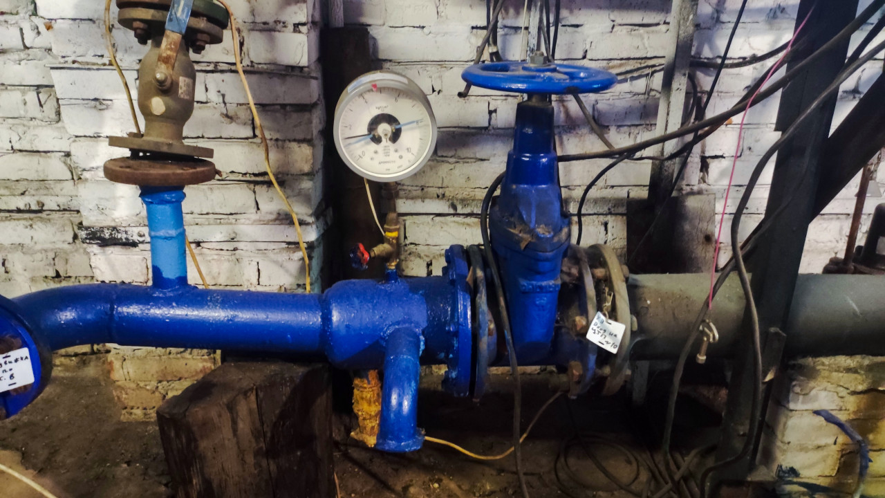 На снимке показан участок трубопровода с установленным вентилем и манометром, подключённым для измерения давления рабочей среды. Трубы окрашены в синий цвет, часть системы закреплена на металлических опорах. Фон составляют кирпичная стена и электропроводка, характерные для технических помещений тепловых пунктов. Фото демонстрирует элементы инженерных коммуникаций и может использоваться для иллюстрации работы коммунальной инфраструктуры и энергосистем.