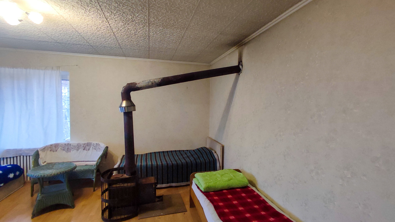 На фото крупным планом показан участок комнаты с установленной печью и металлическим дымоходом, который выходит через стену. На стене заметны следы копоти в месте соединения трубы. Рядом находятся две кровати и мебель из ротанга. Освещение создаётся потолочным светильником, интерьер оформлен просто. Изображение используется для иллюстрации строительных дефектов, технических обследований и контроля состояния систем отопления в жилых помещениях.