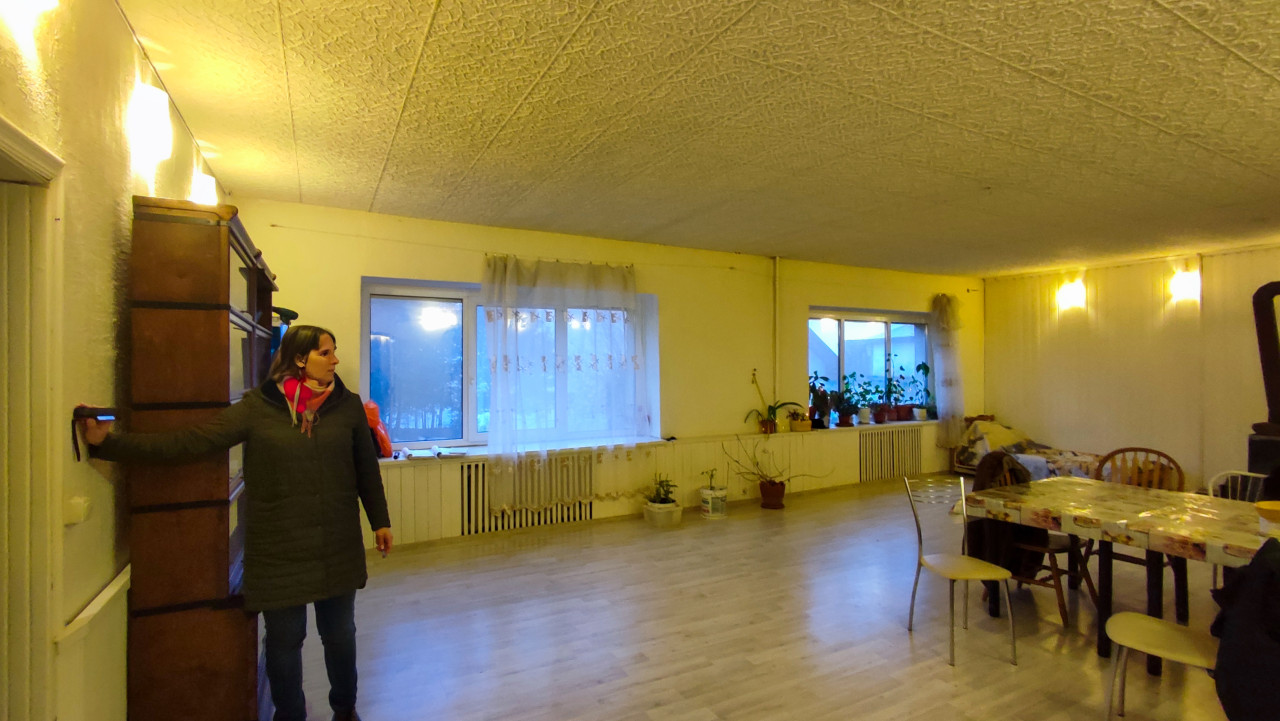 На фотографии запечатлён процесс осмотра просторного помещения в жилом или общественном здании. В комнате установлены крупные окна с пластиковыми рамами и прозрачными занавесками, на подоконниках стоят растения в горшках. На переднем плане — женщина в куртке у стены, рядом деревянный шкаф. На полу уложено светлое покрытие, предположительно ламинат. Вдоль стен — радиаторы отопления. Освещение выполнено настенными светильниками тёплого оттенка. Изображение может быть использовано в публикациях о строительных обследованиях, технических осмотрах зданий, ремонтах или обустройстве интерьеров.
