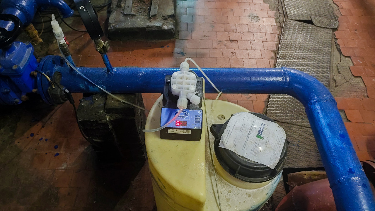 На снимке показан участок теплотехнического узла с установленным дозирующим насосом, соединённым с емкостью реагента для обработки подпиточной воды. Видны элементы трубопровода, соединительная арматура и гибкая подводка к дозирующему устройству. По наличию прозрачного бака рядом с оборудованием можно определить, что здесь используется химический реагент для защиты системы от коррозии и образования минеральных отложений, в том числе применяемый в сетях теплоснабжения. Помещение имеет индустриальный вид с кирпичной стеной и напольным покрытием, характерным для технических зон. Фото подходит для учебных материалов, презентаций о работе тепловых пунктов, иллюстраций для инженерных отчетов и тематических публикаций о промышленной инфраструктуре.