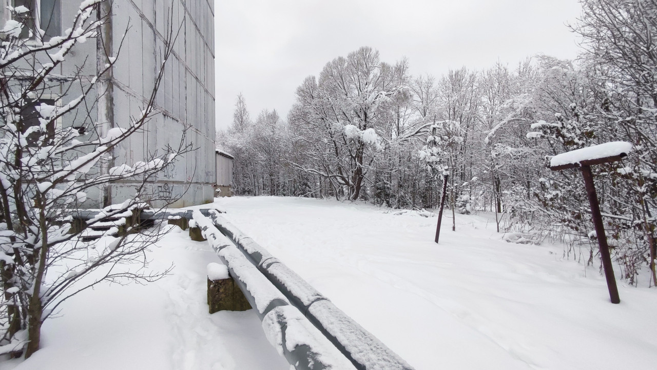 На фотографии изображена дворовая территория за жилым домом панельного типа, примыкающая к лесопосадке. По центру проходит надземный трубопровод на бетонных опорах, покрытых снегом. Здание слева облицовано фасадной сеткой, вероятно временной или защитной, что свидетельствует о проведении ремонтных или утеплительных работ. Справа и на заднем плане видны деревья и кустарник с густым снежным покровом. Снимок отражает характерную для малых населенных пунктов прокладку инженерных коммуникаций по наземной схеме. Изображение может использоваться в материалах о коммунальной инфраструктуре, благоустройстве и сезонной эксплуатации инженерных сетей.