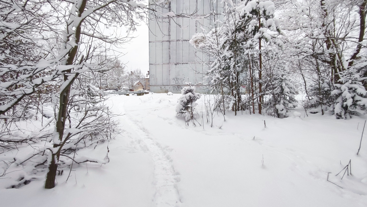 На фото показана тропа, ведущая через лесополосу к торцу панельного жилого дома. Слева и справа от тропы виден кустарник и деревья, покрытые снегом. В глубине композиции различим фасад здания, частично скрытый растительностью. Снимок демонстрирует переход природной зоны в жилую застройку и может использоваться в темах урбанистики, освоения территорий и визуализации границ городской среды.