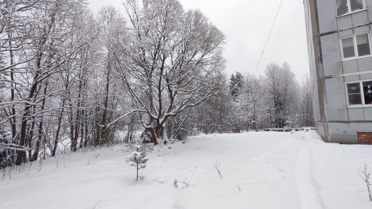 На фотографии изображена лесополоса вплотную к жилому дому, отделенная от застройки узкой снежной тропинкой. Деревья и кустарник покрыты свежим снегом, кроны выглядят утолщенными от осадков. В левой части видна боковая стена здания с окнами, что указывает на близкое соседство жилой зоны и природного участка. Тропинка протаптана пешеходами и уходит вглубь массива. Снимок иллюстрирует пример городской границы между застроенной и природной средой и может использоваться в контексте урбанистики, ландшафтного анализа и сезонных условий эксплуатации территорий рядом с домами.