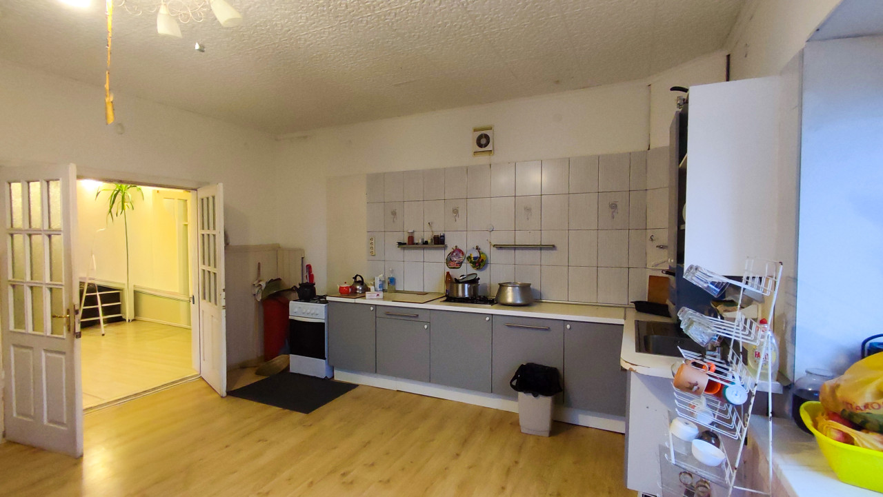 На фото изображена кухня с серыми модулями и белой плиткой на стене. На рабочей поверхности стоят кастрюли, чайник и бытовые принадлежности. В углу видна плита, рядом сушилка с посудой, мусорное ведро и пластиковая ёмкость с продуктами. Дверной проём ведёт в соседнее освещённое помещение. Пол покрыт ламинатом тёплого оттенка. Фото может использоваться для иллюстрации состояния кухонных помещений, ремонта, осмотра бытовых зон или архитектурных проектов реконструкции зданий.