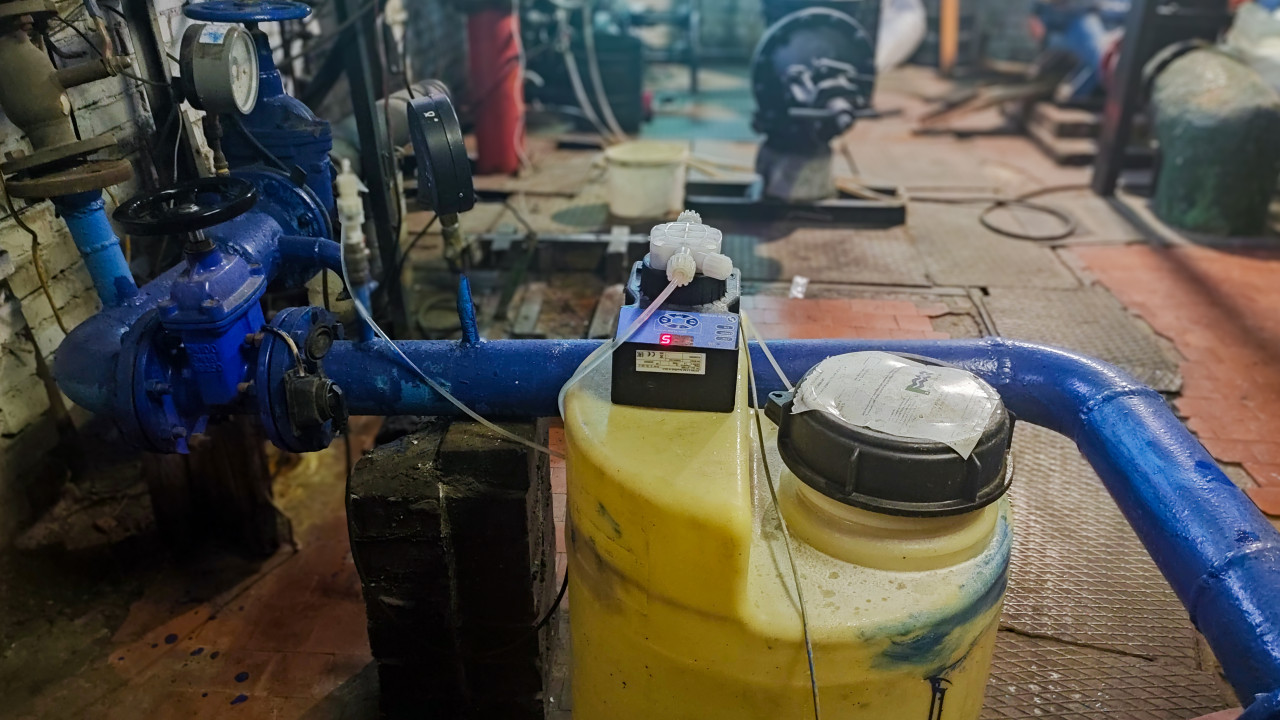 Дозирующий насос на емкости реагента в инженерном помещении