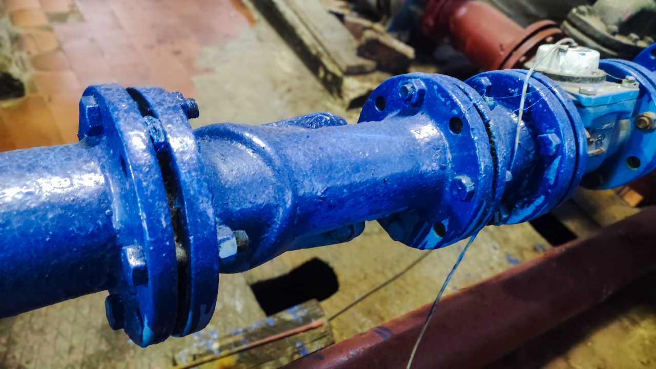 На изображении показан фрагмент трубопровода с фланцевыми соединениями и установленным узлом водомера. В кадре различимы корпус прибора учета, крепления фланцев и болтовые соединения, фиксирующие монтаж участка. Окраска трубопровода выполнена в синий цвет, используемый в инженерных сетях для обозначения холодного водоснабжения. На поверхности заметны следы эксплуатационной окраски и пломбировочный трос, проходящий вдоль соединения. На заднем плане видна часть оборудования инженерного помещения, что указывает на расположение узла в зоне эксплуатации коммунальных систем. Фотография может использоваться в документации по учету ресурсов, материалах о монтаже трубопроводной арматуры и иллюстрациях инженерных узлов.