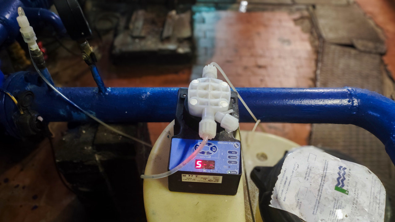 На фотографии показан участок химводоподготовки, установленный в теплотехническом помещении. В кадре виден дозирующий насос, закрепленный на верхней части пластиковой емкости с реагентом для обработки подпиточной воды в системе теплоснабжения. Шланги от насоса уходят в сторону трубопровода, обеспечивая поступление реагента в линию. На крышке бака читается маркировка применяемого состава, используемого для предотвращения коррозии и минеральных отложений в инженерных системах. Окружающее пространство представляет собой обслуживаемую техническую зону с промышленным покрытием пола и трубопроводной разводкой. Изображение может быть использовано в материалах о работе тепловых пунктов и процессе обработки подпиточной воды.