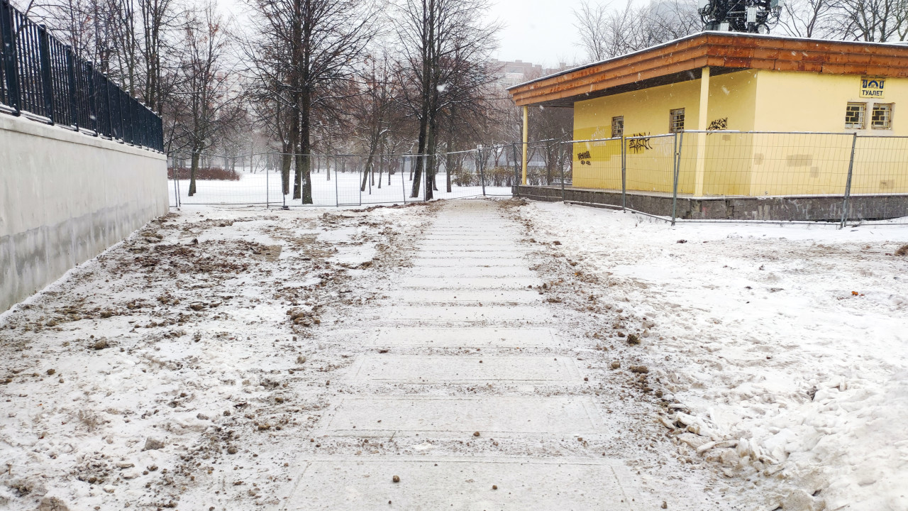 Снимок показывает участок пешеходной дорожки, частично очищенной от снега, ведущей вдоль ограждения к небольшому зданию хозяйственного назначения с надписью «Туалет». На территории присутствуют признаки ремонтных работ: следы техники, строительный мусор и временный забор. На заднем плане видны деревья и элементы городской парковой зоны. Кадр можно использовать для материалов о благоустройстве, коммунальных работах и сезонном содержании инфраструктуры.