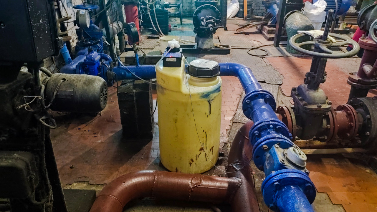 На фотографии показано инженерное помещение с трубопроводами, насосным оборудованием и емкостью, используемой для подачи реагента в систему. В центре кадра расположен пластиковый резервуар цилиндрической формы, рядом проходят металлические трубы с фланцевыми соединениями и запорной арматурой. На заднем плане видны насосные агрегаты, электродвигатели и участки других инженерных линий. Обстановка характерна для эксплуатационной зоны коммунальной инфраструктуры или насосной станции. Компоновка элементов указывает на технологический узел системы водоснабжения, где осуществляется учет и обработка воды. Снимок может применяться для технической документации, отчетов инженерных обследований, обучающих материалов или иллюстраций схем эксплуатации.