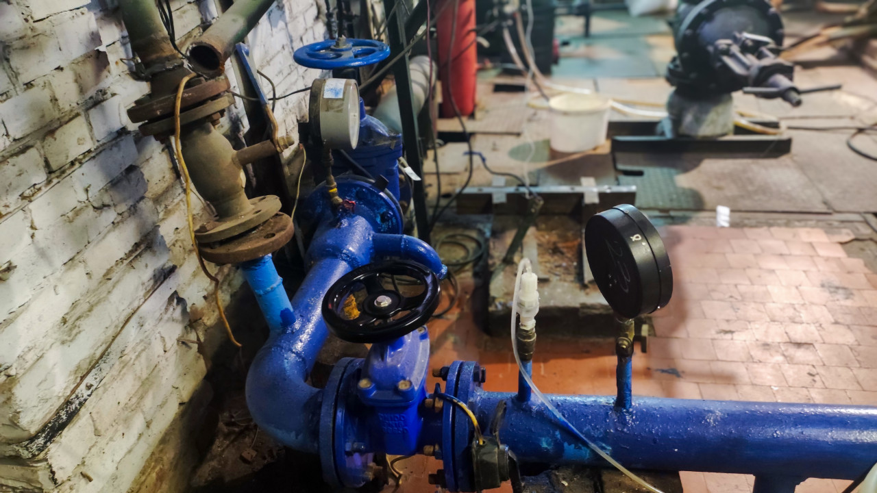 Тепловой узел с насосами и инженерным оборудованием в подвале здания