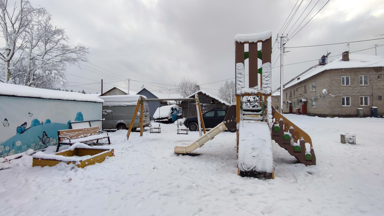 На снимке показана детская игровая площадка, расположенная во дворе многоквартирного жилого дома в зимний период. В кадре видны горка, качели, песочница и скамейка, частично покрытые свежим снегом. На заднем плане находятся хозяйственные постройки, припаркованные автомобили и жилые здания. Наличие детской инфраструктуры указывает на использование территории как дворового общественного пространства. Фотографию можно применять в материалах о благоустройстве жилых районов, социальной инфраструктуре, содержании дворов и сезонной эксплуатации игровых зон.