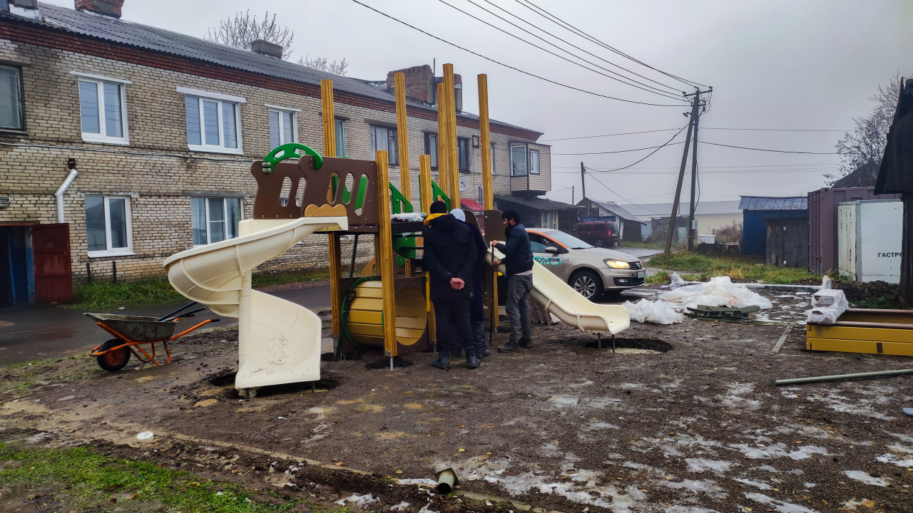 На снимке изображены рабочие, устанавливающие детскую игровую площадку с пластиковыми горками и деревянными элементами. Площадка находится на неасфальтированной площадке перед двухэтажным кирпичным домом. На земле видны строительные материалы, тачка и легковой автомобиль. Фото отражает процесс благоустройства дворовой территории и установки оборудования для детей. Изображение применимо для материалов о городском благоустройстве, строительстве и общественных пространствах.