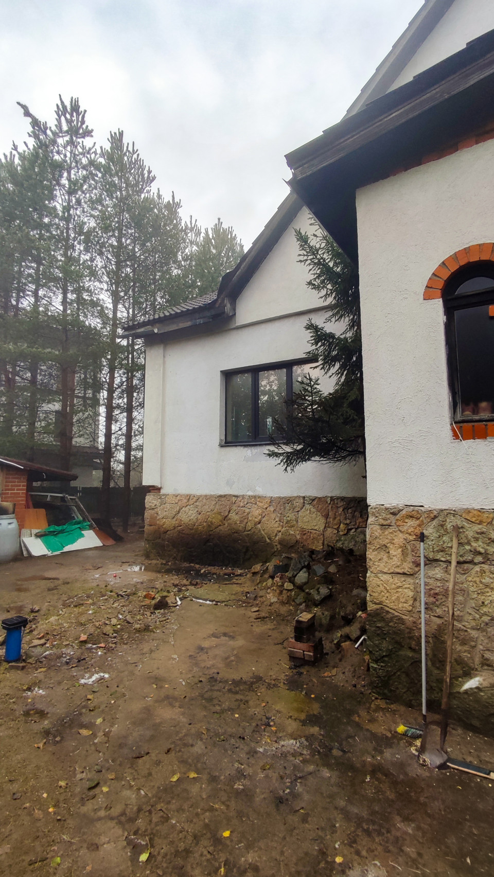 На фотографии изображён угол двухэтажного дома с оштукатуренными белыми стенами и каменным цоколем. Видны пластиковые окна с тёмными рамами, участок земли с остатками строительных материалов и инструментами. На заднем плане — сосны и хозпостройки. Снимок сделан в пасмурную погоду, вероятно, в процессе технического обследования наружных конструкций здания. Изображение подходит для тем о строительстве, реконструкции, ремонте фасадов, обследовании зданий и благоустройстве территории.