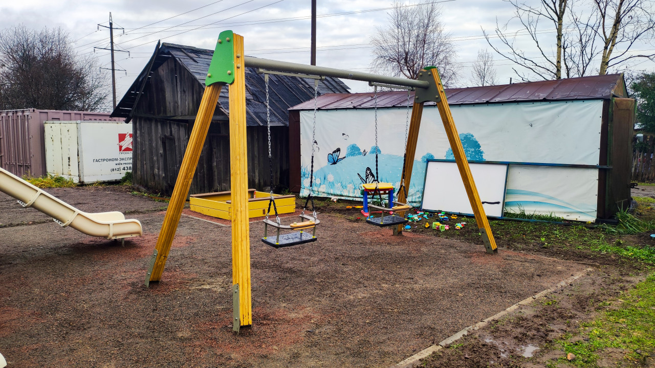 На снимке показана детская площадка с деревянными качелями и пластиковой горкой, установленная рядом с металлическими гаражами и деревянными постройками. На заднем плане виден контейнер и рекламный баннер с изображением бабочек. Поверхность площадки выполнена из мелкофракционного покрытия, что обеспечивает устойчивость конструкции. В кадре также заметны детские игрушки, оставленные после игр. Фото можно использовать для тем, связанных с развитием инфраструктуры небольших поселков, благоустройством территорий и проектированием уличных игровых зон.