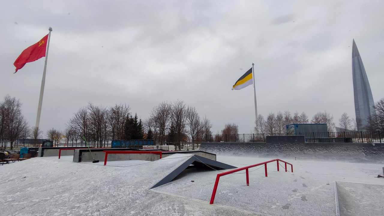 Скейт-парк на фоне Лахта-центра и флагов