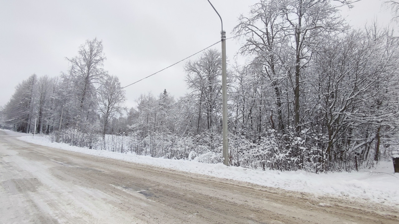 На снимке показана обочина загородной или периферийной дороги, покрытая снегом и примыкающая к лесному массиву. Вдоль проезжей части проходит линия электропередачи на бетонных опорах, одна из которых занимает центральное положение в кадре. Деревья и кустарник сформируют плотную стену по границе дороги, их ветви покрыты снегом. Состояние дороги указывает на зимнюю эксплуатацию с накатом и следами транспорта. Фотография может быть использована в материалах о транспортной инфраструктуре, уличном освещении и сезонных условиях дорожной сети.
