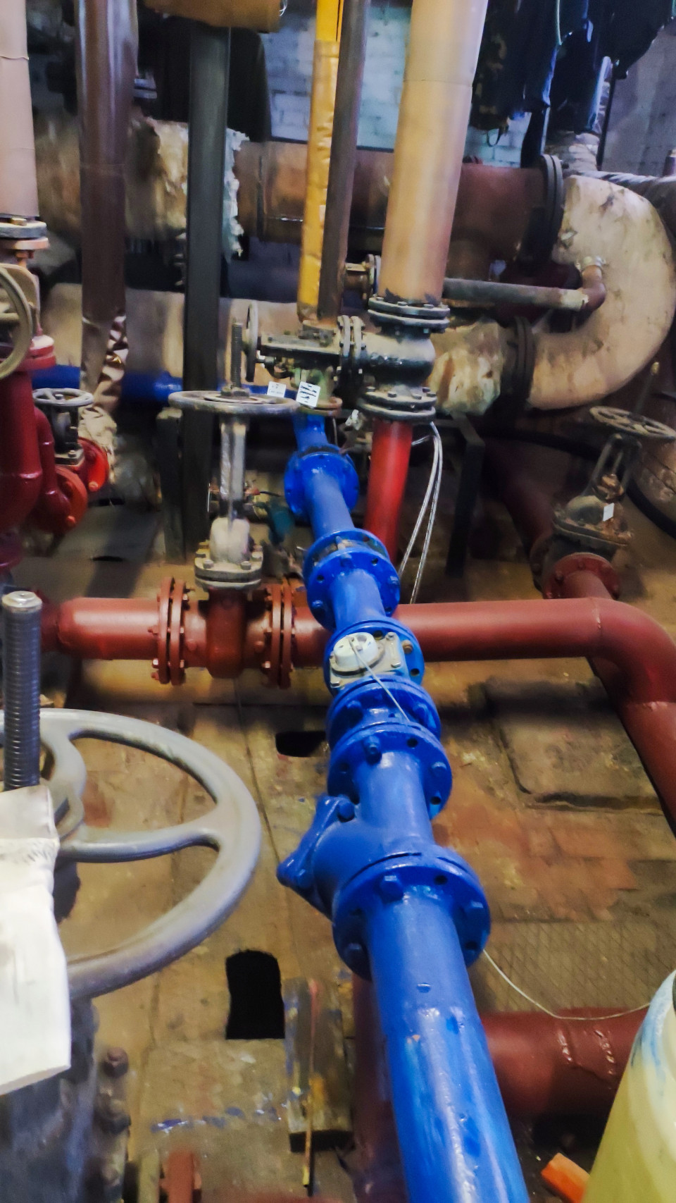 Фото демонстрирует часть трубопроводной системы с видимым фланцевым шаровым краном DN50 PN40, размещенным в составе инженерного узла. Отчетливо прослеживаются магистральные и ответвленные линии, окрашенные в разные цвета, что характерно для распределения подачи и обратки в системах теплоснабжения. Кран входит в состав системы регулирования потока воды или теплоносителя. Снимок сделан внутри помещения с эксплуатационным износом и открытой прокладкой труб. Такой кадр может использоваться в справочных материалах по промышленным инженерным коммуникациям, схемам ИТП и примерам монтажа запорной арматуры.