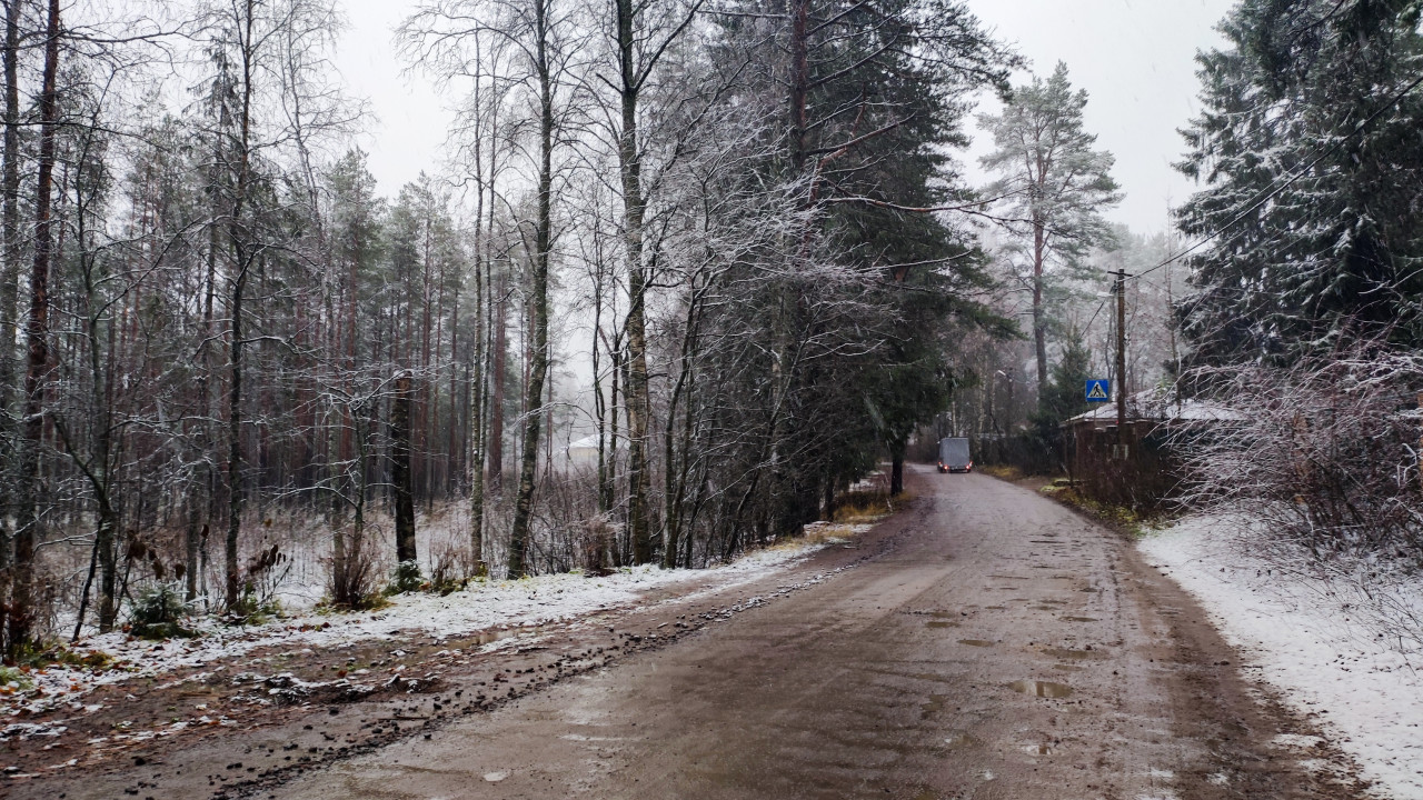 На снимке показана узкая загородная дорога, проходящая вдоль смешанного леса с берёзами и соснами. На поверхности дороги виден тонкий слой снега и следы от шин. Вдали движется грузовик, а вдоль обочины установлены дорожные знаки и линии электропередач. Снег ложится на ветви деревьев и кустарники, создавая ощущение начала зимнего сезона. Снимок отражает повседневную сельскую жизнь и может быть использован для иллюстрации тем о погоде, транспортной инфраструктуре, экологии и сезонных изменениях природы.