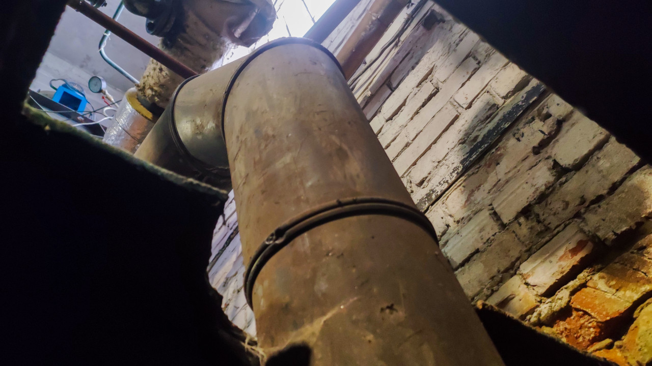 На фото изображен участок металлического трубопровода, размещённый под потолком в техническом помещении. Труба проложена по направляющим опорам и расположена рядом с кирпичной стеной. В верхней части кадра заметны элементы другого оборудования, в том числе прибор контроля давления и теплоизоляция соседних участков. Изображение иллюстрирует размещение инженерных коммуникаций в подвальной зоне и может применяться в материалах по эксплуатации и обследованию систем теплоснабжения.