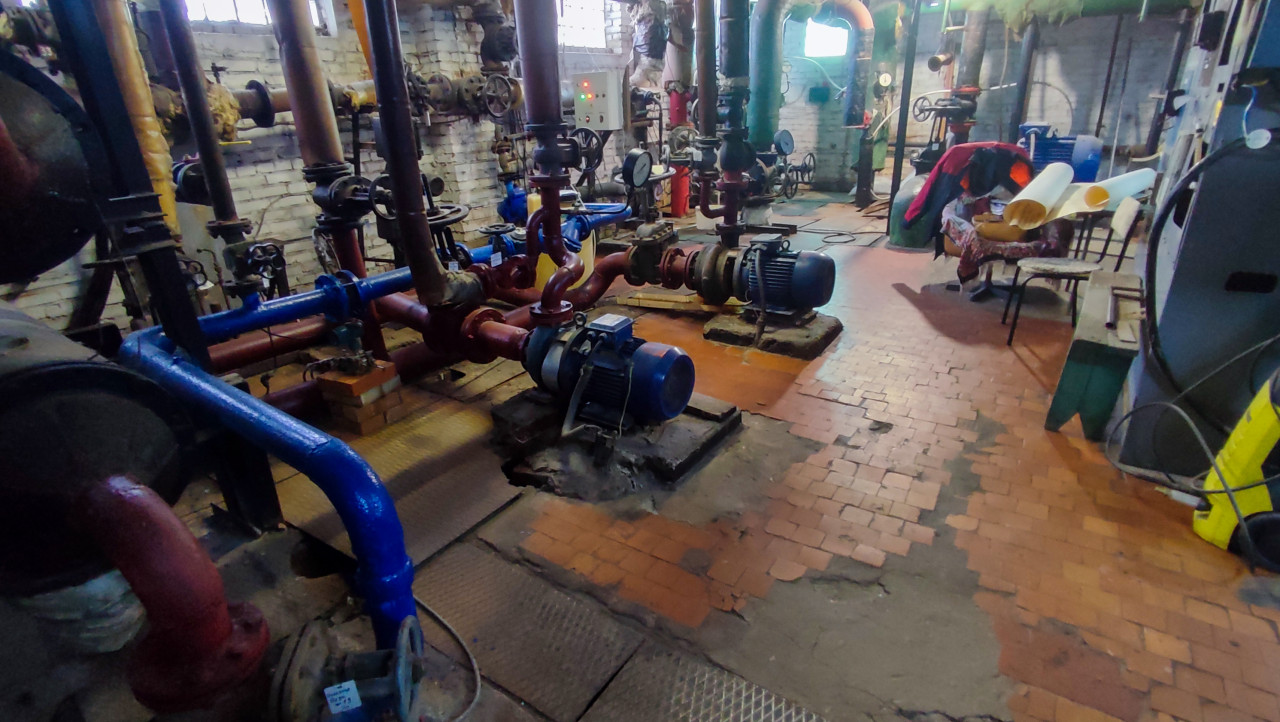 На изображении зафиксировано насосное отделение действующего центрального теплового пункта, где размещены насосы, трубопроводы и распределительные узлы системы теплоснабжения. В кадре присутствуют элементы инженерного обслуживания, теплоизоляция на трубах, измерительные приборы и участки арматуры. На переднем плане виден технический стол с развернутыми чертежами и рабочей курткой, что указывает на эксплуатационные или наладочные работы. Помещение имеет кирпичные стены и естественное освещение через верхние оконные проёмы. Снимок подходит для материалов о работе коммунальных предприятий, инженерных служб и технической инфраструктуры теплоснабжения.