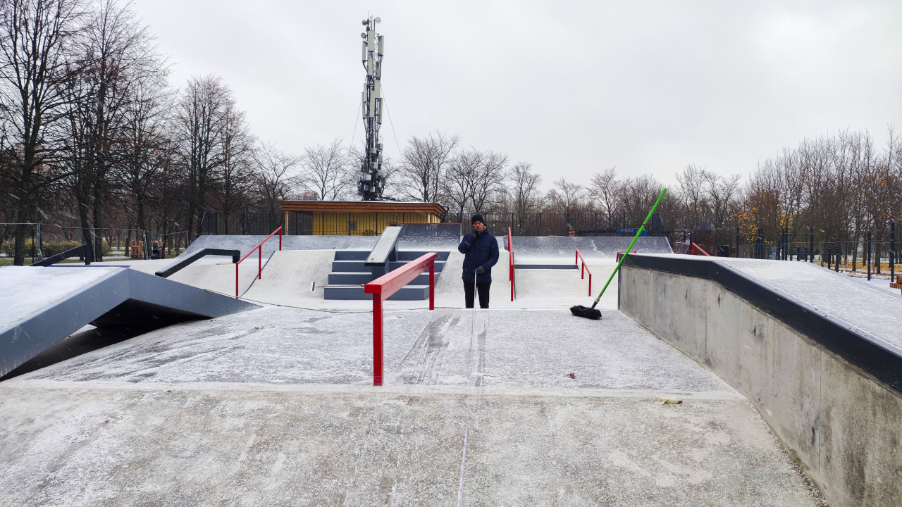 На фото изображен мужчина в тёмной куртке, проводящий визуальный осмотр элементов скейт-парка. Видны бетонные рампы, лестницы, перила и конструкции с металлическими покрытиями, предназначенные для катания на скейтбордах и самокатах. На площадке лежит метла — очевидно, проводится очистка от снега. Фон дополняют деревья и здание с антенной. Снимок сделан зимой, когда объект, вероятно, проходит технический осмотр после завершения строительных работ. Фотографию можно использовать в статьях и презентациях, посвящённых строительству спортивных объектов, контролю качества и городскому благоустройству.
