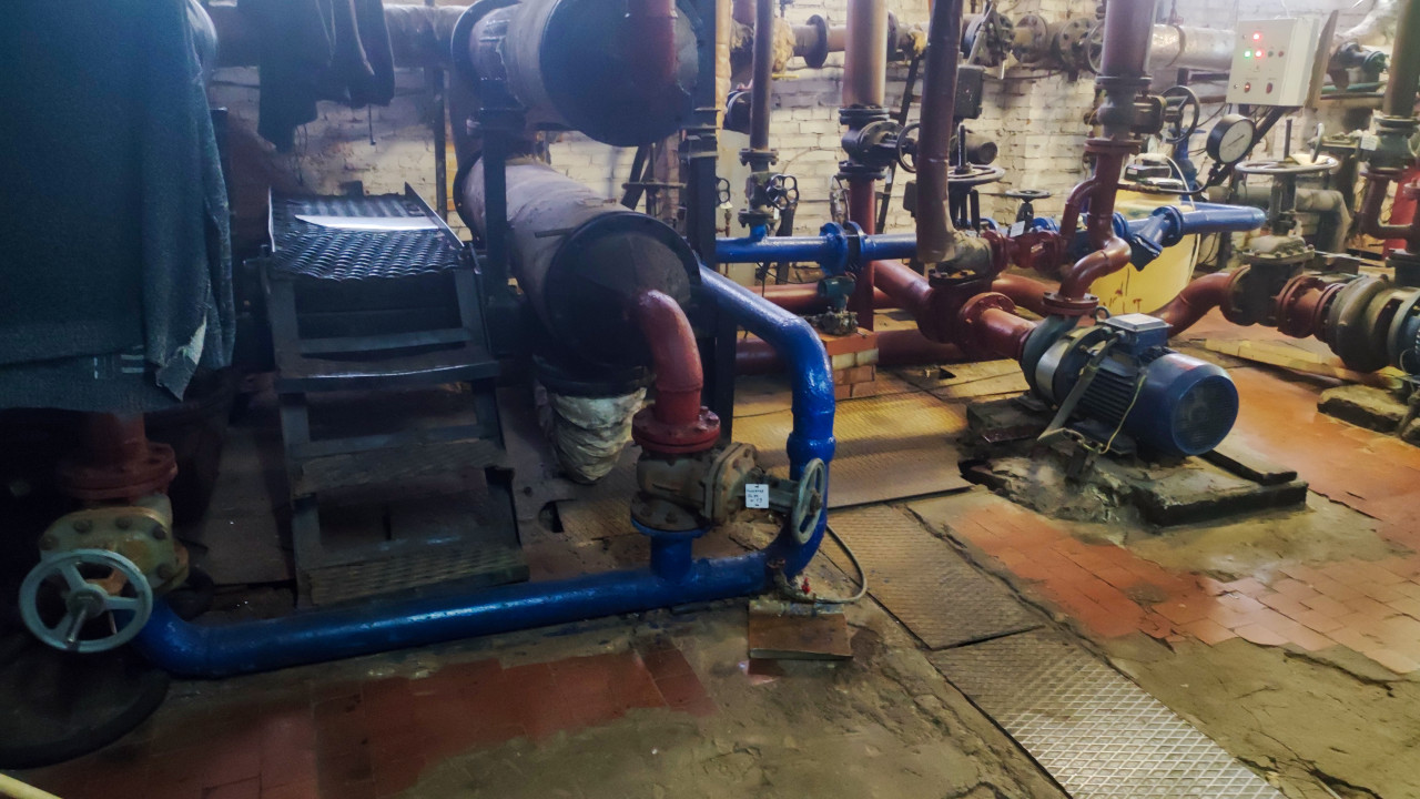 На изображении показан участок внутреннего помещения действующего центрального теплового пункта с установленной насосной группой и теплообменным оборудованием. На переднем плане видны синего цвета трубопроводы с запорной арматурой и фланцевыми соединениями, за ними расположены электродвигатели насосов на бетонных основаниях. В кадре также присутствуют металлические конструкции для обслуживания оборудования, опорные элементы, теплоизоляция на магистралях и распределительный узел. На стене видны трубопроводы обратного и подающего контура с измерительными приборами. Пол частично покрыт металлическими решётчатыми настилами. Снимок можно использовать в материалах об инженерной инфраструктуре, эксплуатации тепловых пунктов и устройстве систем теплоснабжения.