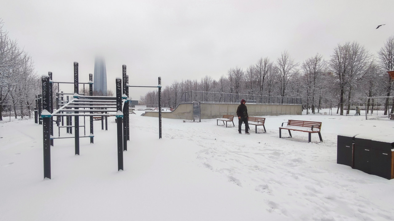 На изображении показана спортивная зона в городском парке, включающая уличные тренажёры или воркаут-конструкции и бетонные элементы скейтпарка, частично покрытые снегом. На заднем плане заметен высокий современный небоскрёб, частично скрытый облачностью, по форме сопоставимый с башней-небоскрёбом. По периметру видны деревья, лавочки и прогулочная зона. Покрытие площадки снежное, что показывает эксплуатацию территории в холодный сезон. Такая фотография подходит для иллюстраций публикаций о развитии городской среды, спортивной инфраструктуры и доступности общественных пространств в зимних условиях.