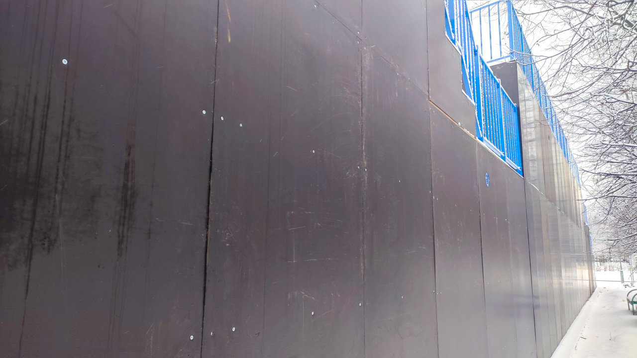 На изображении представлена задняя часть рампы в скейтпарке, обшитая темными листами ламинированной фанеры, закрепленными на металлическом каркасе. Поверхность панелей имеет следы истирания от эксплуатации и крепежные элементы, расположенные по вертикальным стыкам. В верхней части заметны синие металлические ограждения, относящиеся к площадке для трюков или платформе скейтпарка. Съемка выполнена зимой: рядом находятся деревья, ветви которых покрыты снегом, что указывает на сезонную эксплуатацию конструкции в открытом уличном пространстве. Изображение может использоваться в материалах о городской среде, устройстве скейтпарков, спортивной инфраструктуре и примерах благоустройства общественных пространств.