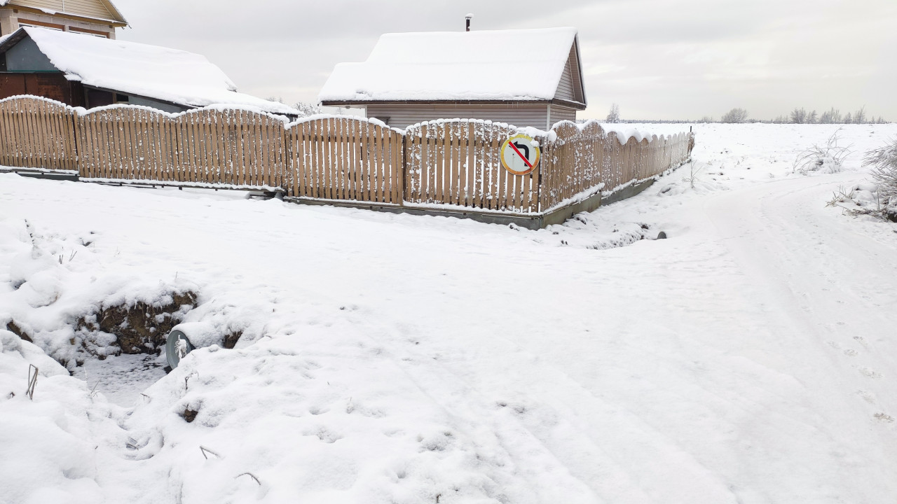 На изображении показан участок сельской улицы, покрытый снегом. В кадре виден деревянный забор и одноэтажное строение за ним. Справа расположена изгородь с щитом, на котором установлен дорожный знак ограничения движения. За ограждением открывается вид на заснеженное поле. На переднем плане заметны следы на снегу и дренажная канава у обочины. Снимок иллюстрирует зимний облик жилой застройки в малых населённых пунктах и может применяться в материалах о сельской инфраструктуре, сезонном содержании территорий и устройстве дворовых проездов.
