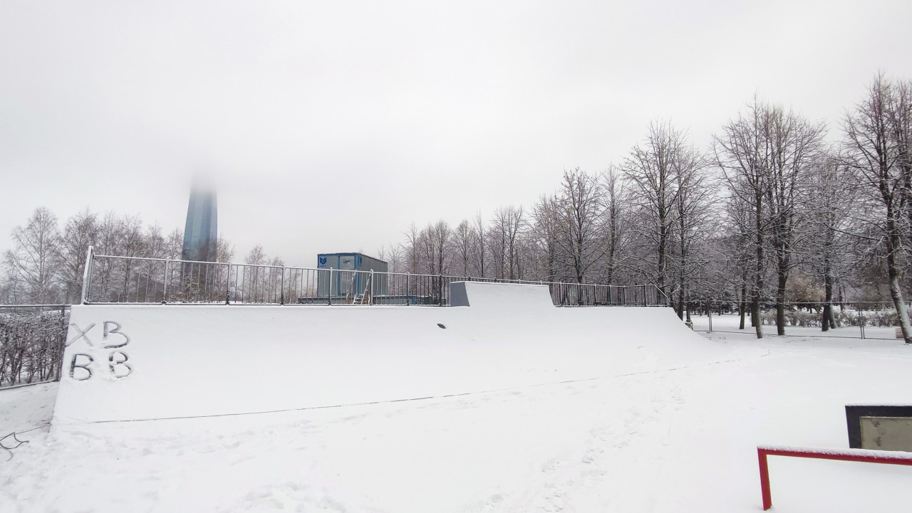На фото изображена крупная бетонная рампа скейтпарка, покрытая снегом, ограждённая металлическими перилами. На боковой части сооружения заметны граффити, оставленные на поверхности. За объектом виднеются деревья, ограждение и строительный контейнер. В дальнем плане заметен высокий современный небоскрёб, частично скрытый туманом и облачностью, что добавляет городской контекст. Сцена отражает зимнюю периодичность эксплуатации экстремальных площадок и их интеграцию в городской ландшафт. Фотография подходит для публикаций о развитии спортивной инфраструктуры и архитектуре общественных пространств.