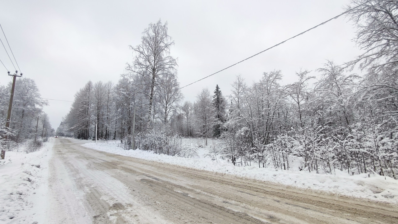На изображении показана загородная или периферийная дорога, покрытая снегом и проходящая вдоль лесополосы. По правому краю кадра расположены деревья и кустарник, густо укрытые снегом. Слева видны опоры воздушной линии электропередачи и отходящие от них провода. Дорога очищена частично, на поверхности заметна смесь снега и накатанного льда. Вдоль проезжей части сформирован снежный вал, характерный для зимней эксплуатации. Снимок может использоваться в материалах о сезонных дорожных условиях, транспортной инфраструктуре, климате и особенностях содержания дорог в холодный период.