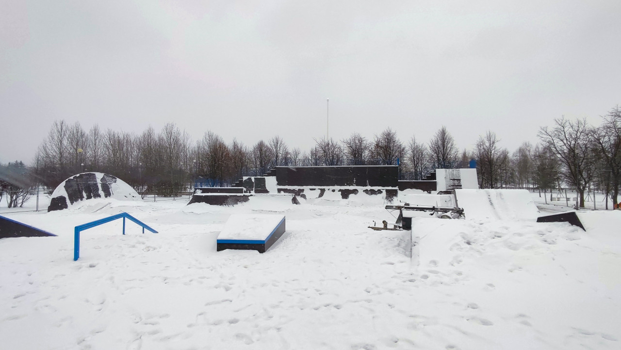 Снимок демонстрирует открытую зону для скейтбординга или BMX с разнообразными фигурами и препятствиями, покрытыми снегом, без присутствия спортсменов. На дальнем плане виднеются деревья и ограждение, а также просторная часть площадки с характерной геометрией настилов. Сезонные условия делают объект временно неиспользуемым, что иллюстрирует особенности эксплуатации уличных спортивных пространств в зимний период. Материал может применяться в статьях о городских парках, молодежной инфраструктуре и управлении объектами спорта.