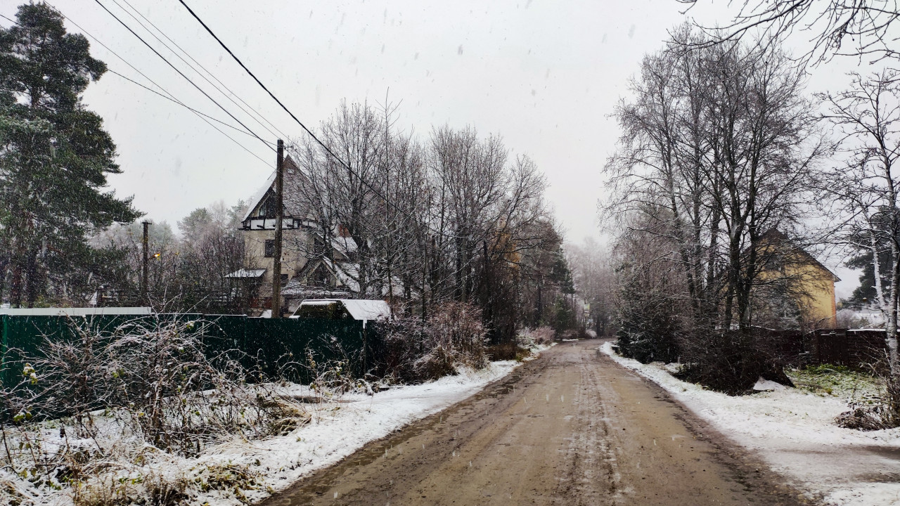 На фотографии изображена загородная улица с частными домами и невысокими заборами во время снегопада. На земле и крышах виден свежий слой снега, по дороге остаются мокрые следы от автомобилей. Вдоль дороги проходят линии электропередач, а деревья частично лишились листвы. Снимок передаёт типичную атмосферу первого снега в небольшом посёлке. Фотографию можно использовать в публикациях о погоде, жилищной архитектуре, жизни в пригороде и сезонных изменениях климата.