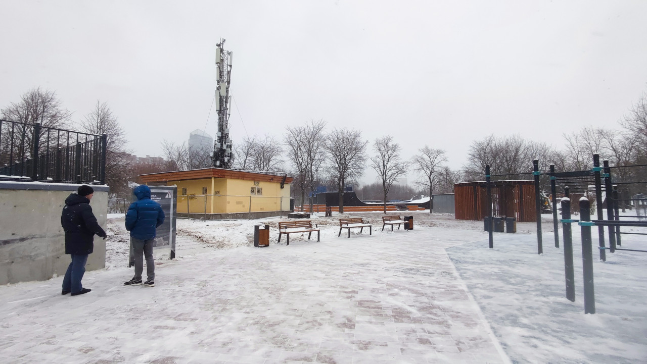 На фото показана часть парковой площади с уличными тренажерами и расчищенной дорожкой, рядом расположено хозяйственное здание с антенной связной инфраструктуры на крыше. На заднем плане видны скамейки и деревья без листвы. Присутствуют два человека, осматривающие информационный щит, что подчеркивает общественный характер территории. Снимок может использоваться для публикаций о городской спортивной инфраструктуре, благоустройстве и эксплуатации общественных парков зимой.