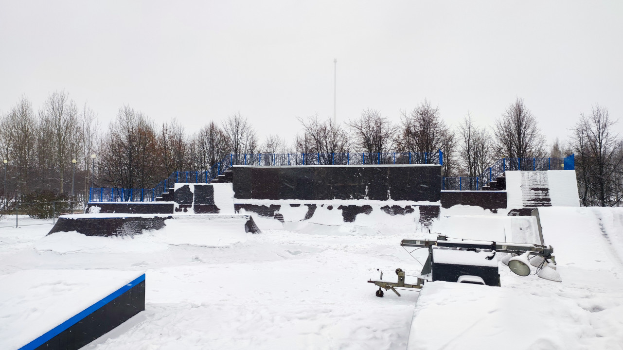 Центральная зона городского скейтпарка под снегом