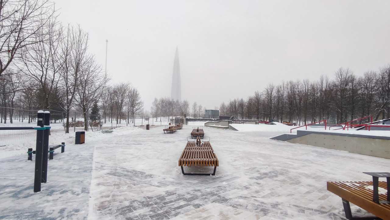 На снимке изображён заснеженный участок парковой территории, совмещающий прогулочную зону и элементы скейтпарка, на заднем плане частично в тумане виднеется башня Лахта Центр — современный городской архитектурный ориентир Санкт-Петербурга, построенный в 2012–2019 годах и являющийся самым высоким зданием в Европе. Вдоль центра кадра установлены скамейки, справа заметны рампы и перила. Слева расположены элементы уличных тренажёров, а контуры деревьев указывают на зимний период. Кадр подходит для публикаций о городской среде, благоустройстве и туристической навигации.