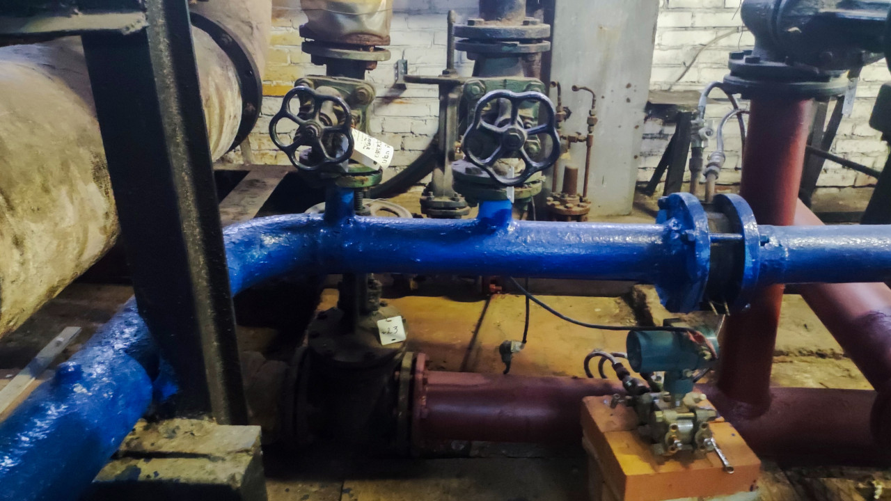 Система трубопроводов с резервуаром и измерительными приборами в подвале