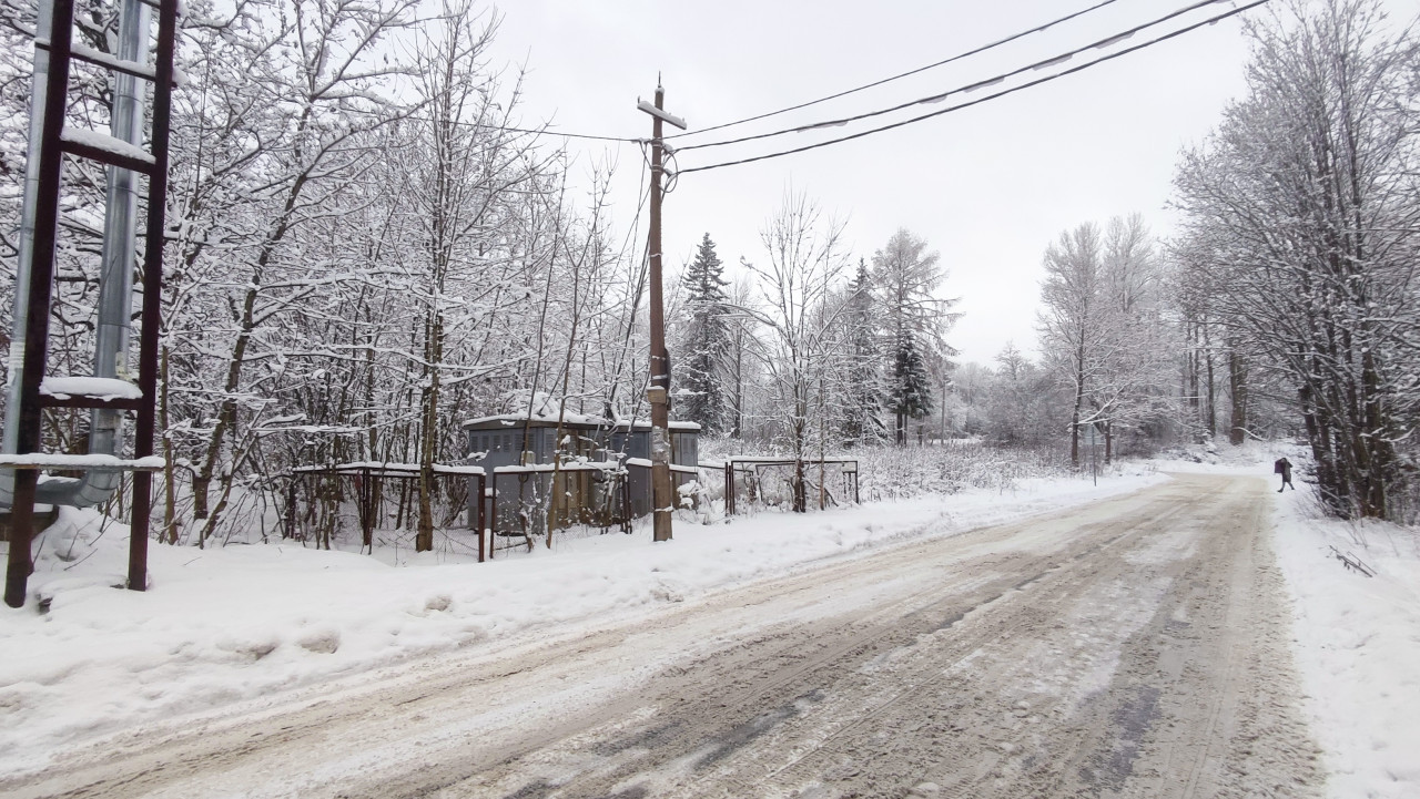 На фотографии изображён распределительный пункт (трансформаторная будка), расположенный вдоль загородной дороги в зимний период. Объект огорожен металлическим забором и подключён к воздушной линии электроснабжения, проходящей по опорам вдоль полотна дороги. Такие трансформаторные узлы используются для понижения напряжения и распределения электроэнергии к жилым домам и вспомогательным сооружениям в пригородных и сельских зонах. В кадре также видны линии проводов, поддерживающие связь будки с магистральной линией. Окружение представлено снегом, лесополосой и неширокой дорогой с автомобильной колеёй, что указывает на эксплуатацию объекта в условиях низкой плотности застройки. Изображение может применяться в материалах о работе электрораспределительных сетей, обслуживании подстанций, инженерной инфраструктуре и энергообеспечении малых населённых пунктов.
