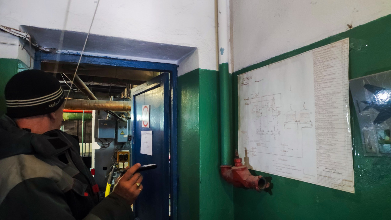 На изображении человек рассматривает схему инженерных сетей, закреплённую на стене в производственном помещении. На кадре видна часть оборудования, трубопроводов и дверной проём, ведущий внутрь технической зоны. Схема представляет собой эксплуатационный документ, отображающий технологические связи, арматуру и назначение трубопроводов в системе. Рядом располагается участок пожарного трубопровода с выводом под подключение. Помещение имеет характерные для теплопунктов или котельных элементы: окрашенные стены, металлические двери, инженерные магистрали и распределительные узлы. Подобные изображения применяются при описании условий эксплуатации и в материалах по техническому надзору и обслуживанию инженерных систем.