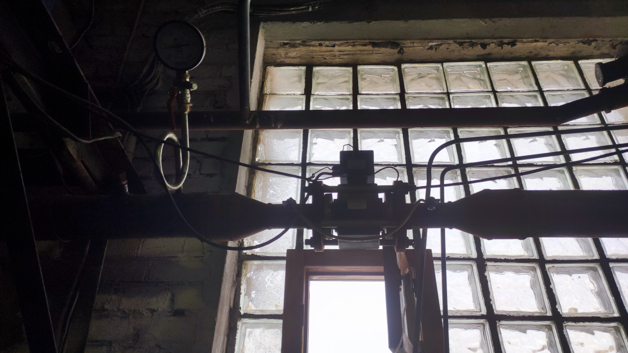 На фото изображён участок трубопровода с установленным манометром, расположенный в помещении теплового узла или котельной. На заднем плане видно оконный проём, составленный из стеклоблоков, пропускающих рассеянный свет. К трубопроводу подведены питающие линии и кабели, вероятно относящиеся к прибору контроля параметров. Арматура и металлические конструкции создают характерную для инженерных помещений техникумную среду. Снимок может использоваться для иллюстрации работы инженерных сетей, оборудования теплопункта и элементов измерения давления.