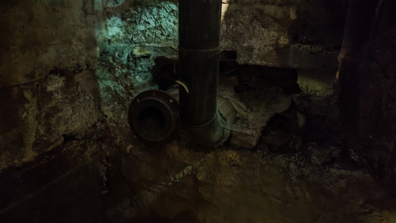 На фото показан фланцевый вывод трубопровода, расположенный на бетонной стене технического помещения. Труба установлена вертикально и выходит через нишу в стене, на нижнем участке имеется фланцевое соединение с торцевым отверстием. Поверхность стены имеет следы старой штукатурки и эксплуатации, что характерно для подвальных зон и инженерных помещений. Фотография может использоваться в материалах, связанных с демонтажем или реконструкцией трубопроводных линий, обследованием инженерных коммуникаций и технической экспертизой помещений.