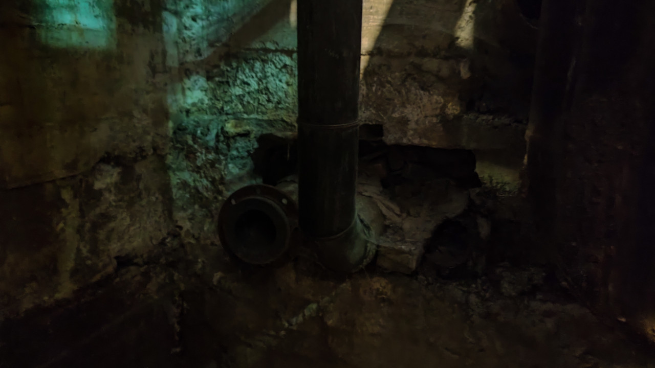 На изображении показан вертикальный трубопровод, установленный вдоль стены в подвальном или инженерном помещении. В основании трубы виден фланцевый узел, а часть стены вокруг имеет следы износа и старой кладки. Освещение приглушено, что указывает на расположение участка в технической зоне без естественного света. Такой тип снимков используется для иллюстрации инженерной инфраструктуры зданий, осмотров коммуникаций и отчётной документации о состоянии трубопроводов.