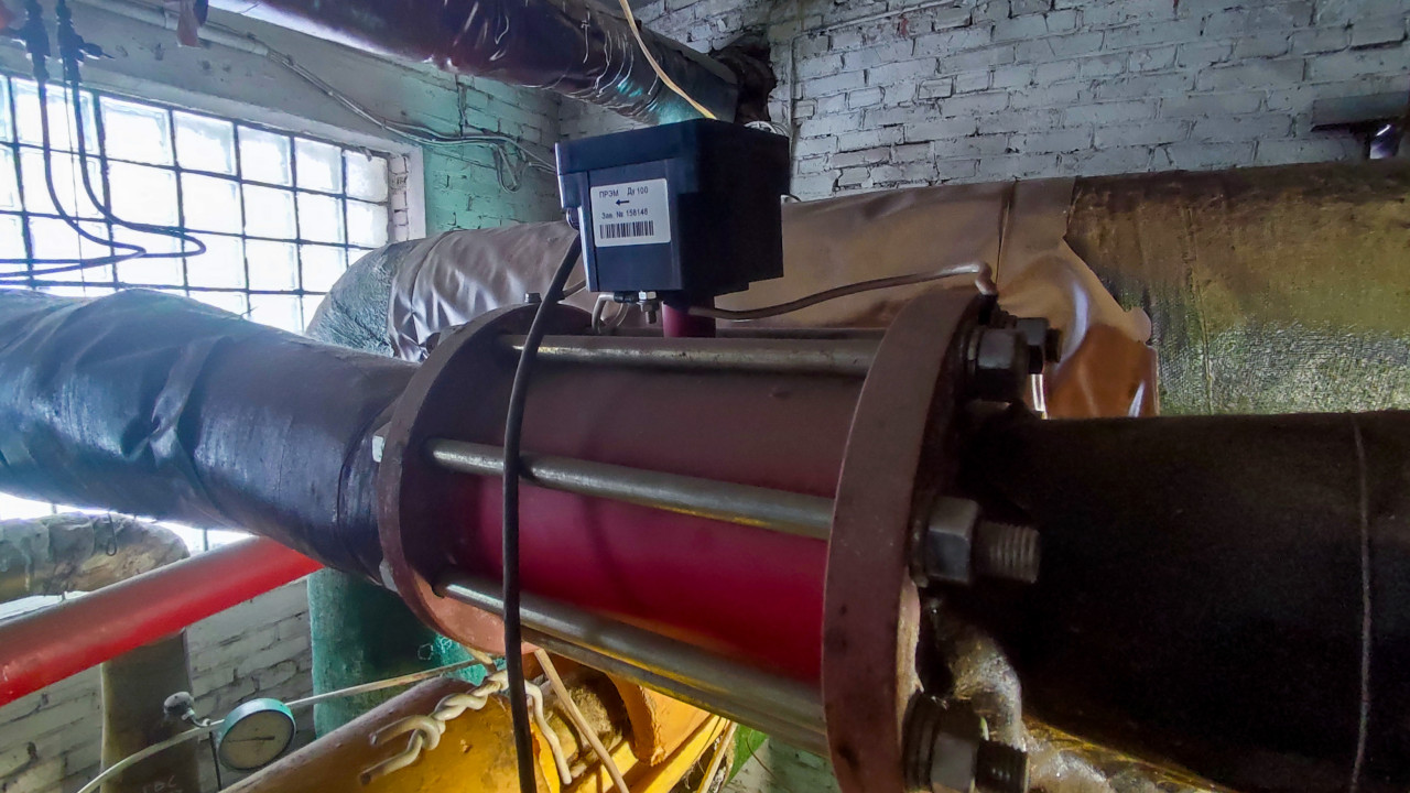 На изображении виден участок трубопровода с цилиндрическим элементом, на котором закреплён блок датчика или измерительного устройства. Деталь соединена фланцами и стяжными шпильками, к корпусу подведён кабель питания или сигнализации. На фоне заметны изолированные магистрали и кирпичная стена технического помещения. Кадр подходит для иллюстрации инженерных сетей и размещения оборудования контроля параметров.