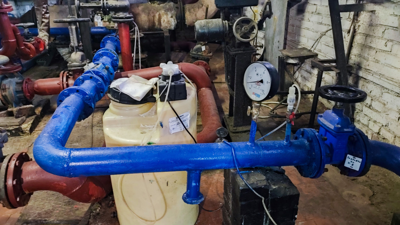 Изображен промышленный участок трубопровода с задвижкой, манометром и системой дозирования реагентов в пластиковой емкости. Трубопровод окрашен в синий цвет, рядом виден красный контур соседней линии. Манометр показывает давление до 10 бар, подключенный к системе через штуцер. Помещение выглядит как тепловой пункт или насосная станция. Фото иллюстрирует эксплуатацию инженерных систем, контроль параметров и обслуживание водопроводных и тепловых сетей. Подходит для технических статей, инструкций и обучающих материалов по инженерии.