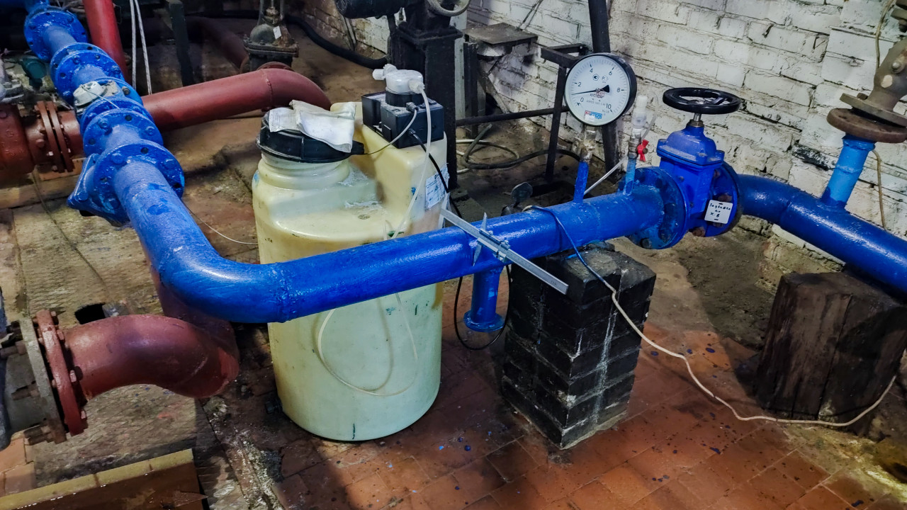 На фотографии показан участок инженерной линии с трубопроводом синего цвета, установленным на опорных кирпичных блоках и соединенным с запорной арматурой. Рядом размещен пластиковый бак для дозирования реагентов с насосным оборудованием на крышке, к которому подведены трубки. В кадре также виден манометр с верхним подключением, используемый для контроля давления в линии. На фоне заметны дополнительные трубопроводы красного цвета и техническое помещение с кирпичными стенами. Фото иллюстрирует внутренний узел теплоснабжения или водоподготовки, характерный для тепловых пунктов и насосных станций. Снимок может применяться в технической документации, учебных материалах по эксплуатации инженерных систем и иллюстрациях промышленной инфраструктуры.