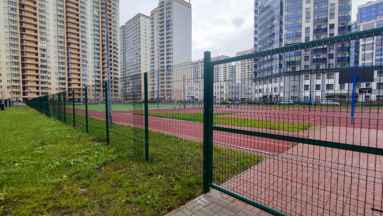 На фото показан фрагмент ограждения спортивного поля, выполненного из металлической сетки, на фоне многоэтажных жилых домов. В центре виден вход с калиткой, мощёной плиткой дорожкой и участками зелёного газона по бокам. Вдали различимы футбольные ворота, спортивные снаряды и современные здания со стеклянными фасадами. Изображение отражает современную городскую архитектуру и благоустройство жилых комплексов.
