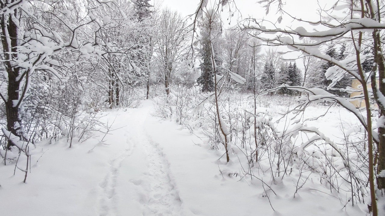 На фотографии изображена утоптанная узкая тропа, проходящая через лесной массив и окруженная кустарником и деревьями, покрытыми снегом. Растительность имеет естественную структуру, без признаков благоустройства, что указывает на природный характер территории. Тропа проложена самими пешеходами и ведет вглубь лесополосы. Сцена может использоваться как иллюстрация зимних прогулок, сезонной рекреации, неформальных маршрутов и пригородных природных зон.