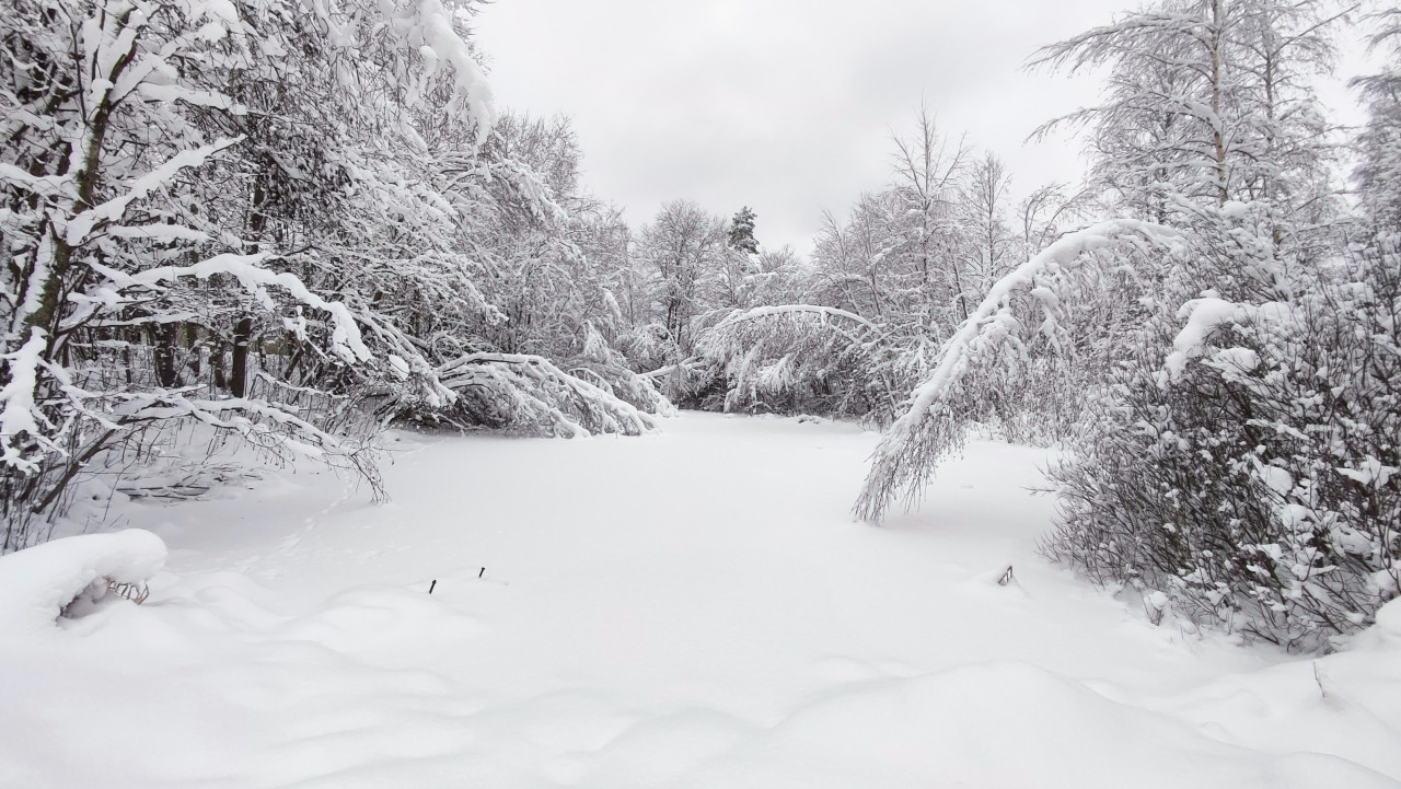 На изображении показан открытый участок местности, полностью покрытый снегом, примыкающий к лесному массиву. Деревья на заднем плане наклонены под тяжестью осадков, ветви густо укрыты снегом. Рельеф плоский, без видимых строений или инженерных объектов. Такой тип кадра используется для визуализации природных условий, сезонности и зимнего ландшафта.