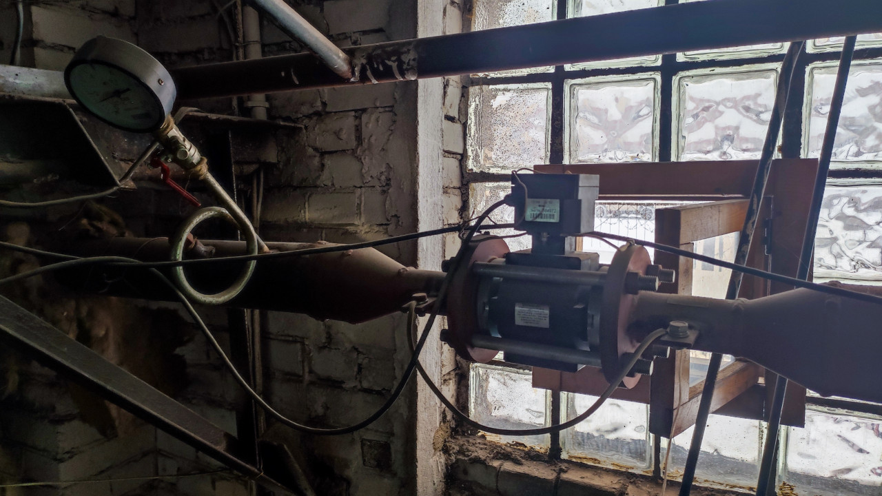 На фотографии показан фрагмент инженерного трубопровода внутри старого технического помещения, вероятно теплового узла или бойлерной. Слева установлено аналоговое измерительное устройство — манометр с импульсной линией, присоединённой к отборному штуцеру. Трубопровод выполнен из металлических труб большого диаметра и проложен вдоль кирпичной стены, частично с признаками коррозии. В кадре видны элементы обвязки, металлические опоры, запорная арматура и электрические провода, проложенные поверх труб. В фоне присутствует старое стеклоблочное окно, характерное для промышленных зданий советского периода, пропускающее рассеянный свет. Изображение может применяться в публикациях о теплотехнике, обслуживании систем теплоснабжения и работе инженерных сооружений.